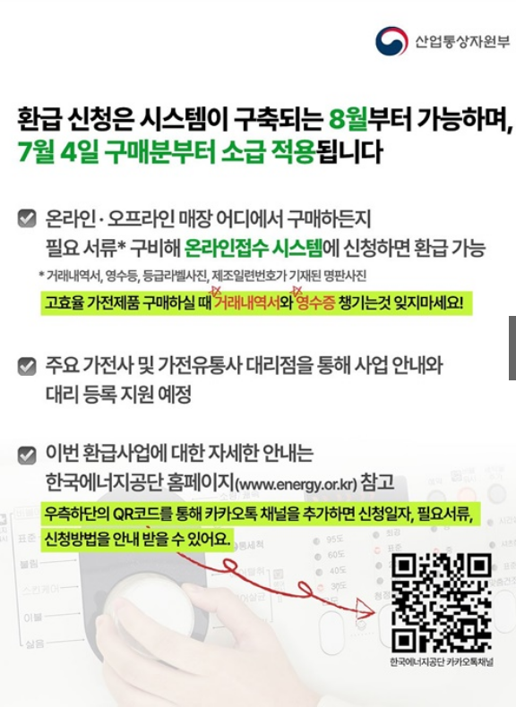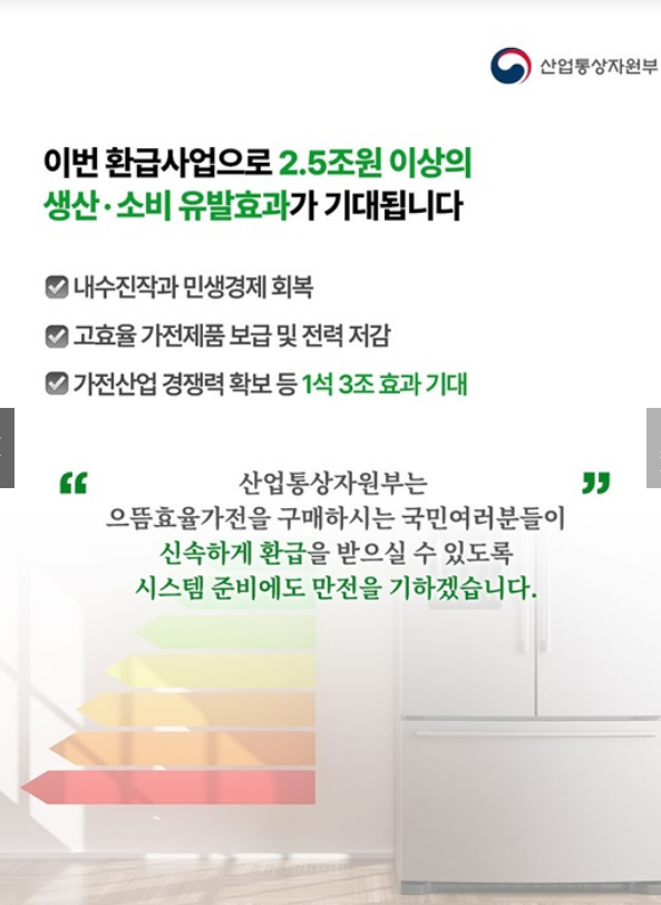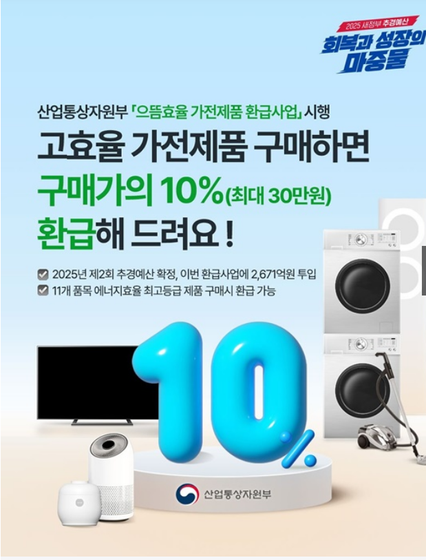 산업통상자원부가 주관하는 전 국민 대상 현금 환급 지원사업으로, 2025년 7월 4일 이후 구매한 고효율 가전제품(1등급 기준)에 대해 10% 환급, 개인당 최대 30만 원까지 지원합니다.